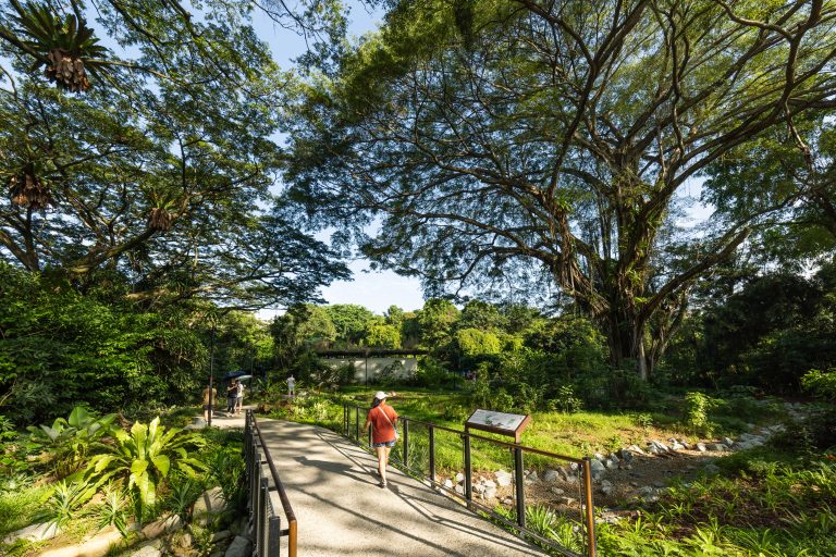 Steps, platforms, and boardwalks provide diverse experiences along the water’s edge, while a water circulation system and a filtering system, complemented by the uptake of aquatic plants, significantly improves water quality. During wet weather, rainwater also collects at the upper marshland and flows through the lower marshland into a swale known as the Ficus Stream, eventually cascading into Alkaff Lake. This innovative approach of incorporating natural topography into the design not only aids sustainable water management within the park but also transforms the water system into a more nature-driven drainage system that saves energy and operates autonomously.