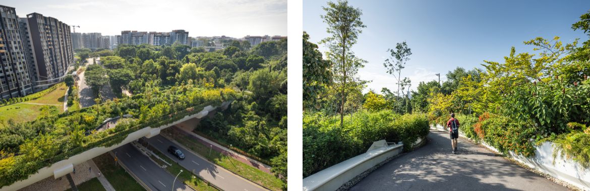 A land bridge was designed to link the main area of Bidadari Park to the hillock across the road. The land bridge is mostly planted with carefully curated species of plants and trees, with its footpath flanked on both sides by lush greenery. Not only does this improve accessibility for estate residents and visitors to the park, but the land bridge also acts as a conducive route for butterflies and birds to travel across. This “linking green to the green” concept creates a continuous habitat corridor, supporting both the local ecosystem and the park’s role as a sanctuary for wildlife.