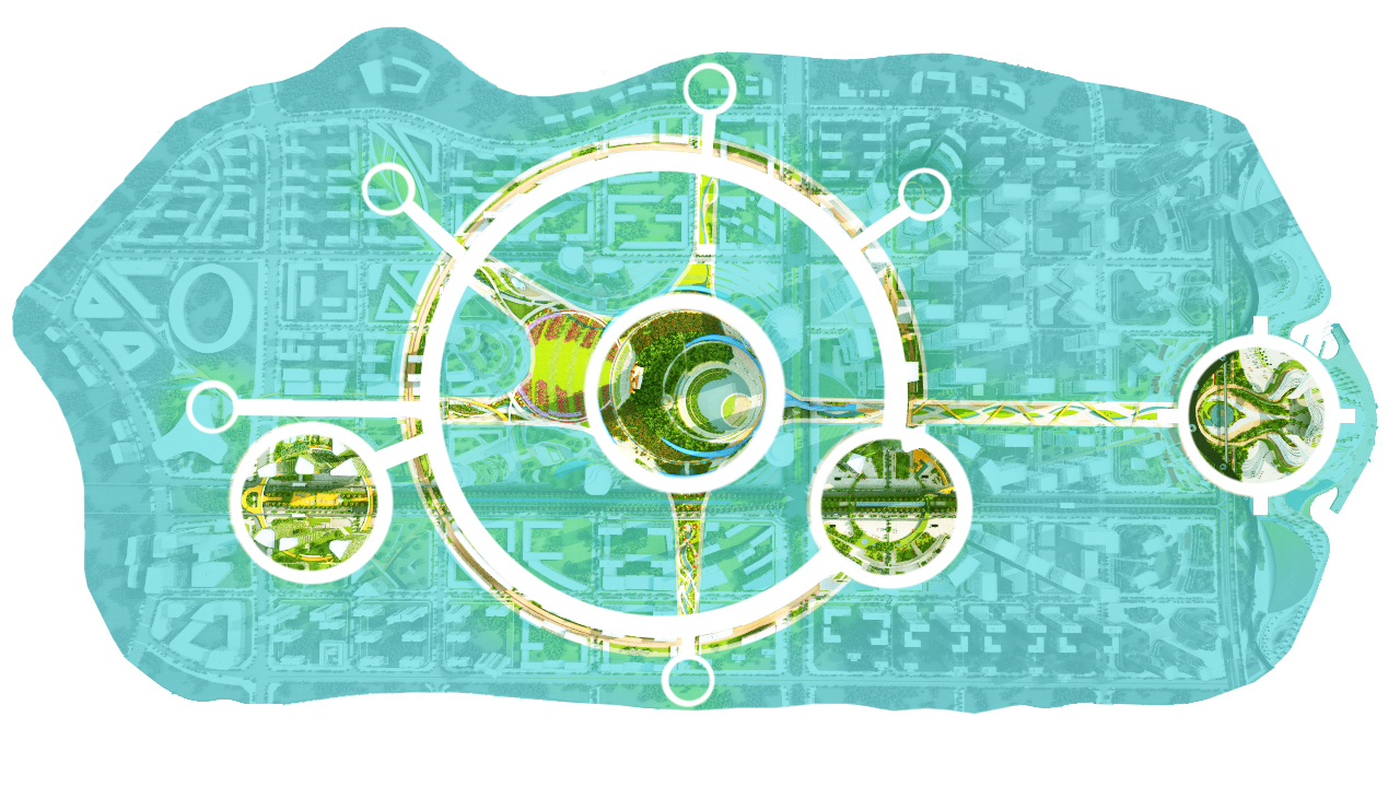 With Central Park as the core, the masterplan creates a five-axis experiential-corridor-open-space structure that emphasises the linking of the entire island through the connection between the Central Park, Mount Tianzhu, the International Bayfront, as well as green corridors leading to other spaces in the city, thus forming a vibrant activity belt and leisure environment for the residents.