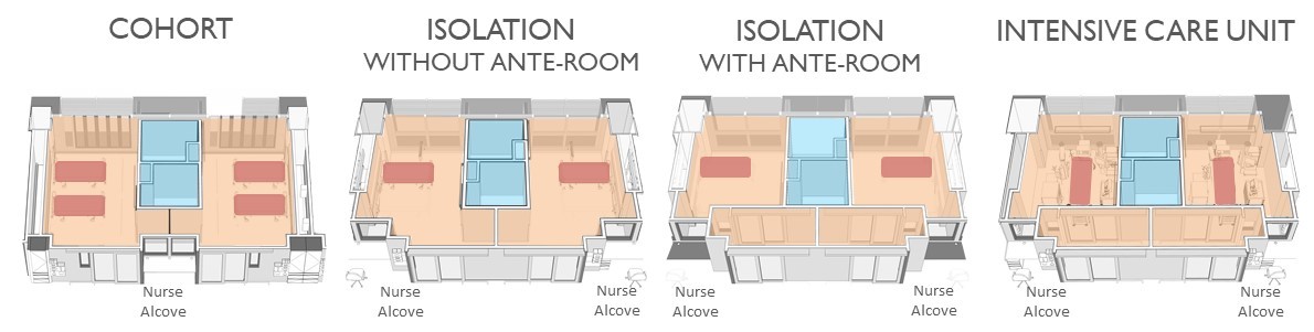 An infectious health facility should be designed to provide appropriate isolation and intensive care units for inpatient care. Four types of patient rooms (Cohort, Isolation room with no ante-room, Isolation Room with ante-room and Intensive Care Unit) are designed based on a modular template, with similar sizes and similar toilet cores regardless of the type of patient room. This makes it easier to convert from one room type to another in future should the need arise. For example, if more rooms with ante-rooms are needed, renovation would be much easier with rooms based on a modular template, than if the room structures were very different to begin with. Every room has also to be tested for air-tightness at the completion of construction.