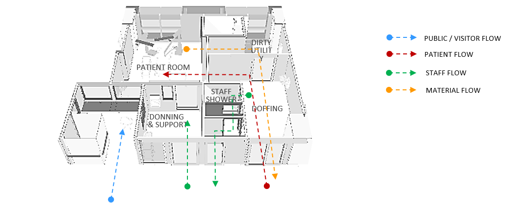 Visitor Flow: While visitors are not encouraged due to the risk of infection, research evidence has shown that patients recover better with the presence of their loved ones. Therefore, in order to accommodate visitors yet ensure their safety, patient and visitor routes are separated clearly. Patients are brought into the patient room via the doffing room. Visitors (restricted) will be permitted to enter the ward and communicate with the patient through a viewing window.