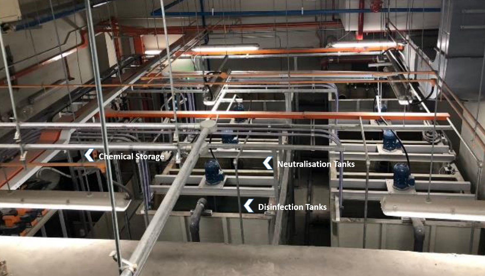 Apart from the control of contaminated air, sanitary waste from the patient areas are disinfected before being discharged to the public sewer. The process involves a dedicated set of sanitary pipes leading to collection tanks. From the tanks, the waste is pumped in batches to dozing tanks where sodium hypochlorite is used for disinfection. The treated waste is further chemically balanced to the correct acidity levels for discharge to the public sewer.